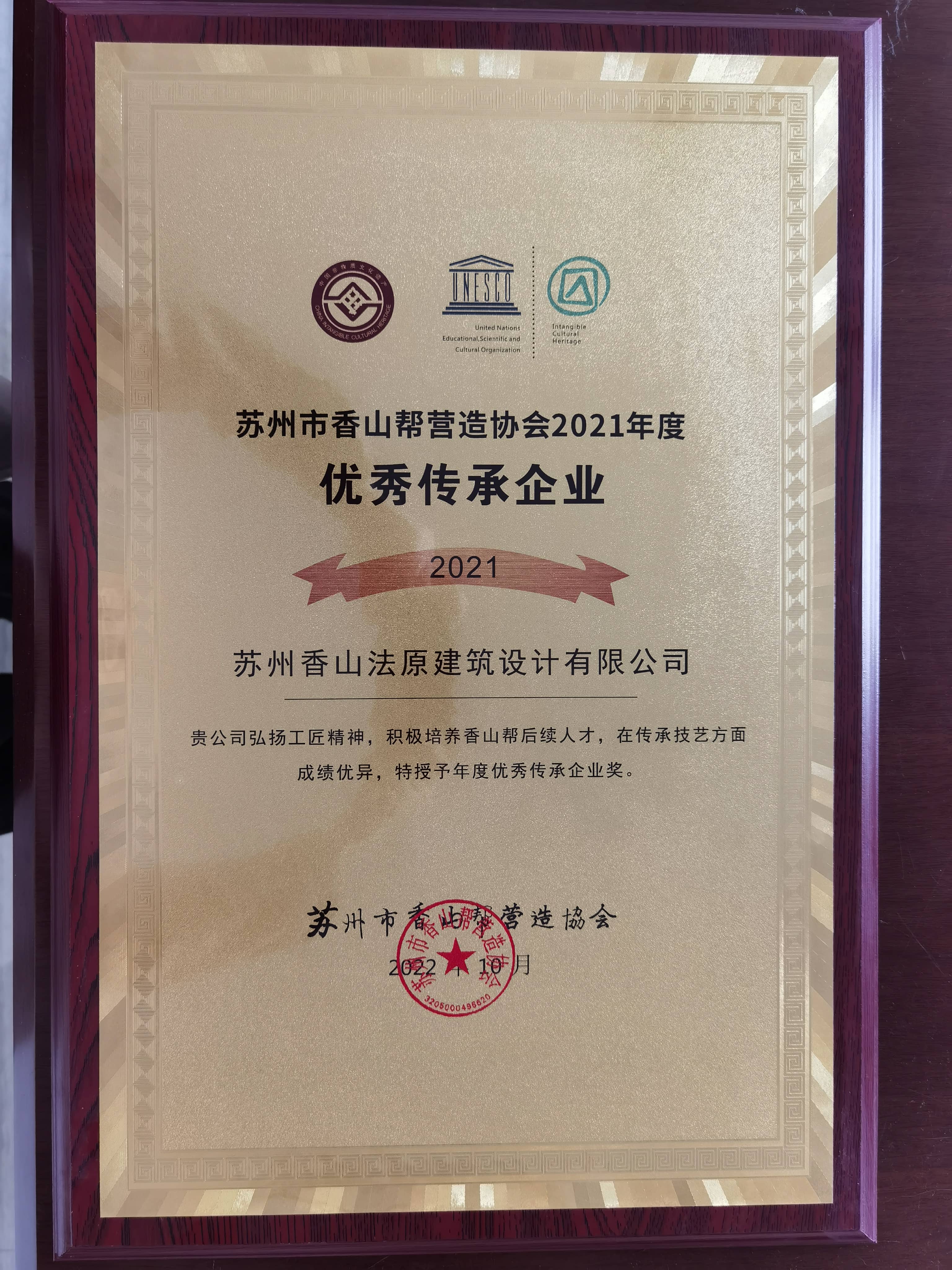 為了鼓足干勁,協(xié)會(huì)對(duì)2021年度評(píng)出的各項(xiàng)優(yōu)秀項(xiàng)目進(jìn)行了頒獎(jiǎng)。蘇州香山法原建筑設(shè)計(jì)有限公司獲得了“蘇州市香山幫營(yíng)造協(xié)會(huì)2021年度優(yōu)秀傳承企業(yè)”的殊榮,以表彰我司在堅(jiān)守初心,弘揚(yáng)工匠精神,保持香山幫傳統(tǒng)特色,積極培養(yǎng)香山幫后續(xù)人才,在香山幫技藝文化的傳承和創(chuàng)新等方面做出的貢獻(xiàn)。這份榮譽(yù)將激勵(lì)和鞭策我們不斷前進(jìn),以時(shí)不我待的精神更加努力工作,為促進(jìn)世界非遺香山幫技藝的傳承與發(fā)展,推動(dòng)中華民族文化的偉大復(fù)興作出應(yīng)有的貢獻(xiàn)。