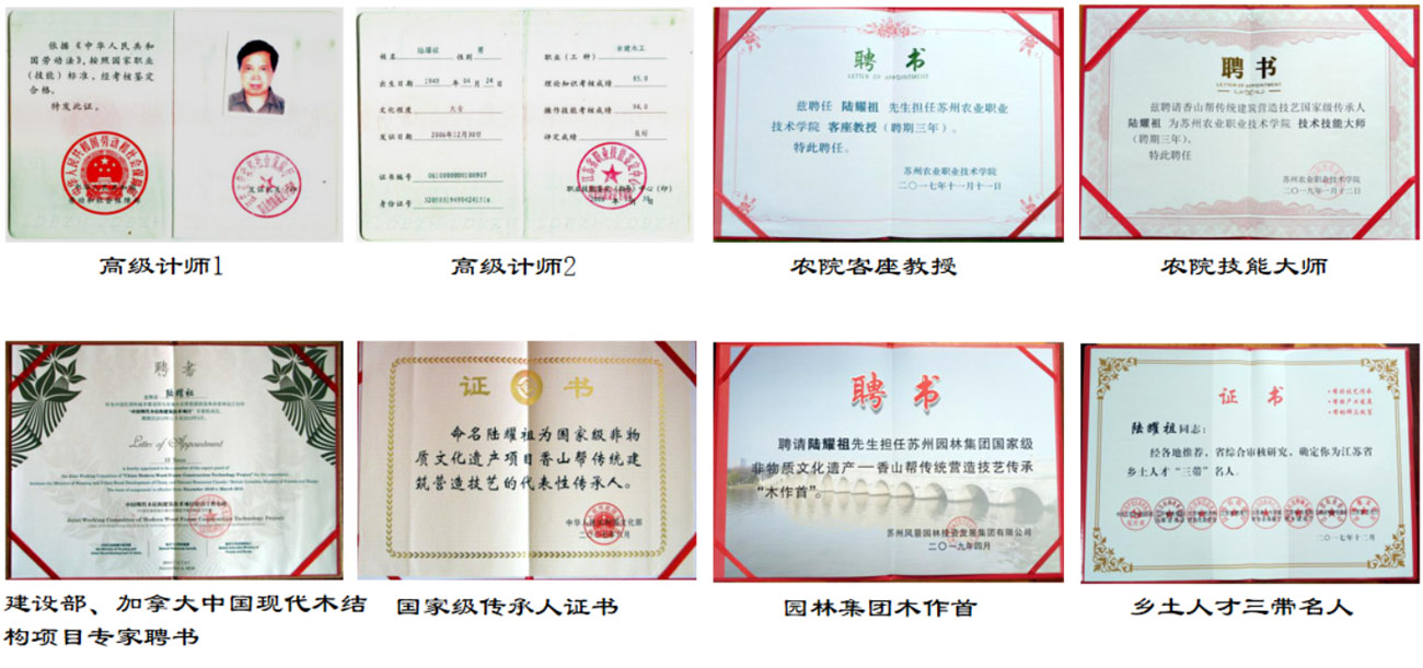 陸耀祖大師是蘇州吳縣香山人,香山幫傳統(tǒng)營造技藝國家級(jí)非物質(zhì)文化遺產(chǎn)傳承人;祖上世代為香山幫建筑匠人,陸大師則是家族第六代傳人,很好的繼承了中國傳統(tǒng)古典建筑技藝。榮獲“高級(jí)技師”、“國家級(jí)傳承人”等榮譽(yù)稱號(hào),承建的工程獲得“揚(yáng)子杯”、“姑蘇杯”等多項(xiàng)省、市優(yōu)質(zhì)工程獎(jiǎng)。